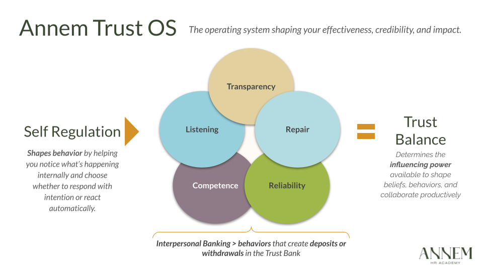 Our trust operating system gives your team a shared language for what's really happening in their interactions. At its core is Interpersonal Banking™, the idea that every interaction is either a deposit or a withdrawal into the trust bank people co-own with one another. Five key behaviors drive the balance: Listening, Transparency, Repair, Competence, and Reliability. Self-regulation is the entry point: the ability to notice what's happening internally before reacting on autopilot.